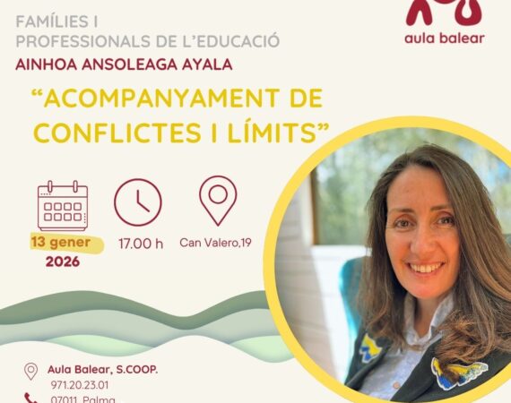 Acompanyament de conflictes i límits Benvolguda comunitat educativa,El proper Dimarts 13 de gener, a les 17h la pedagoga Ainhoa Ansoleaga farà una xerrada professional sobre l'acompanyament de conflictes i límits dels infants de totes les edats.Preu: 12 euros.Famílies d'Aula Balear: 5 euros.Inscripció: https://forms.gle/RLzxkqDxUqWXPxHH6